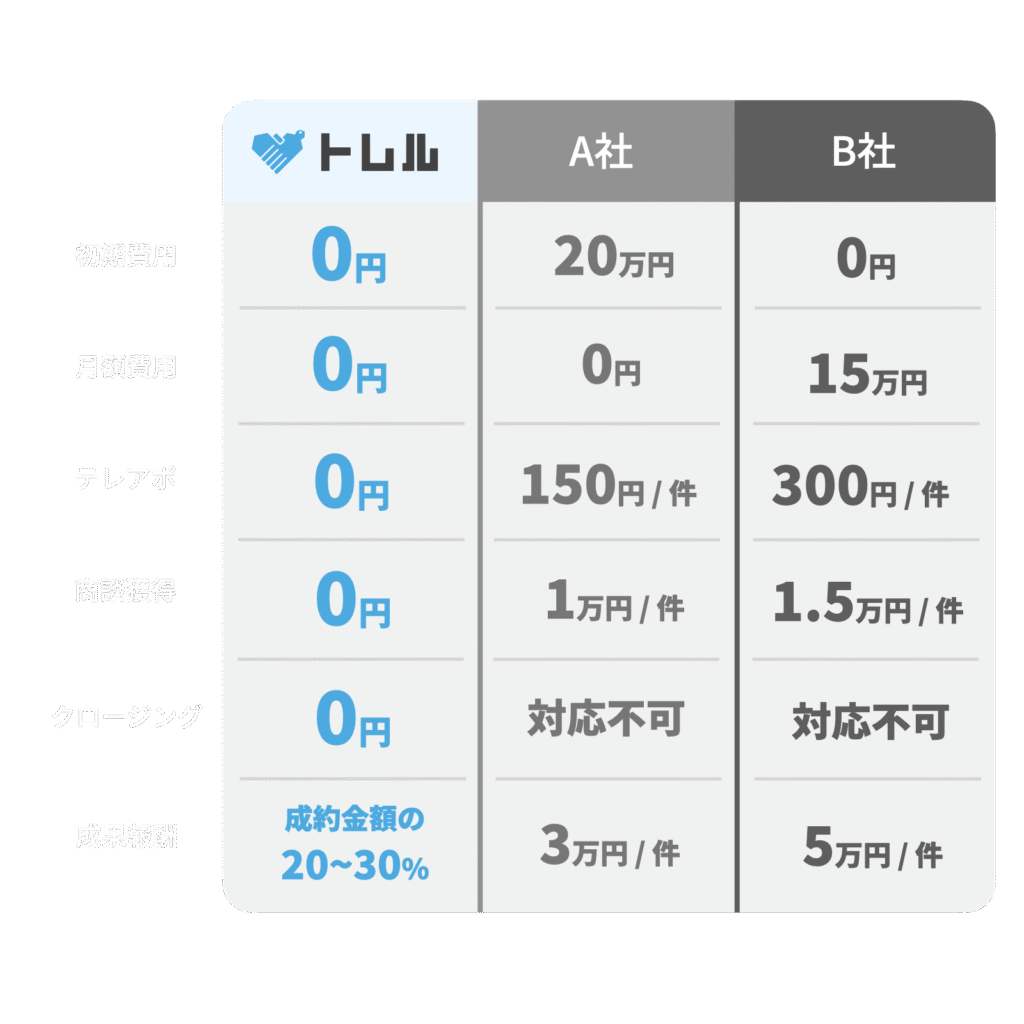 トレルでは成果報酬型のみの営業代行を行っており、案件が成約し、納品と入金が完了するまで料金は発生しません。アポイントから商談まで全て無料で実施しております。
